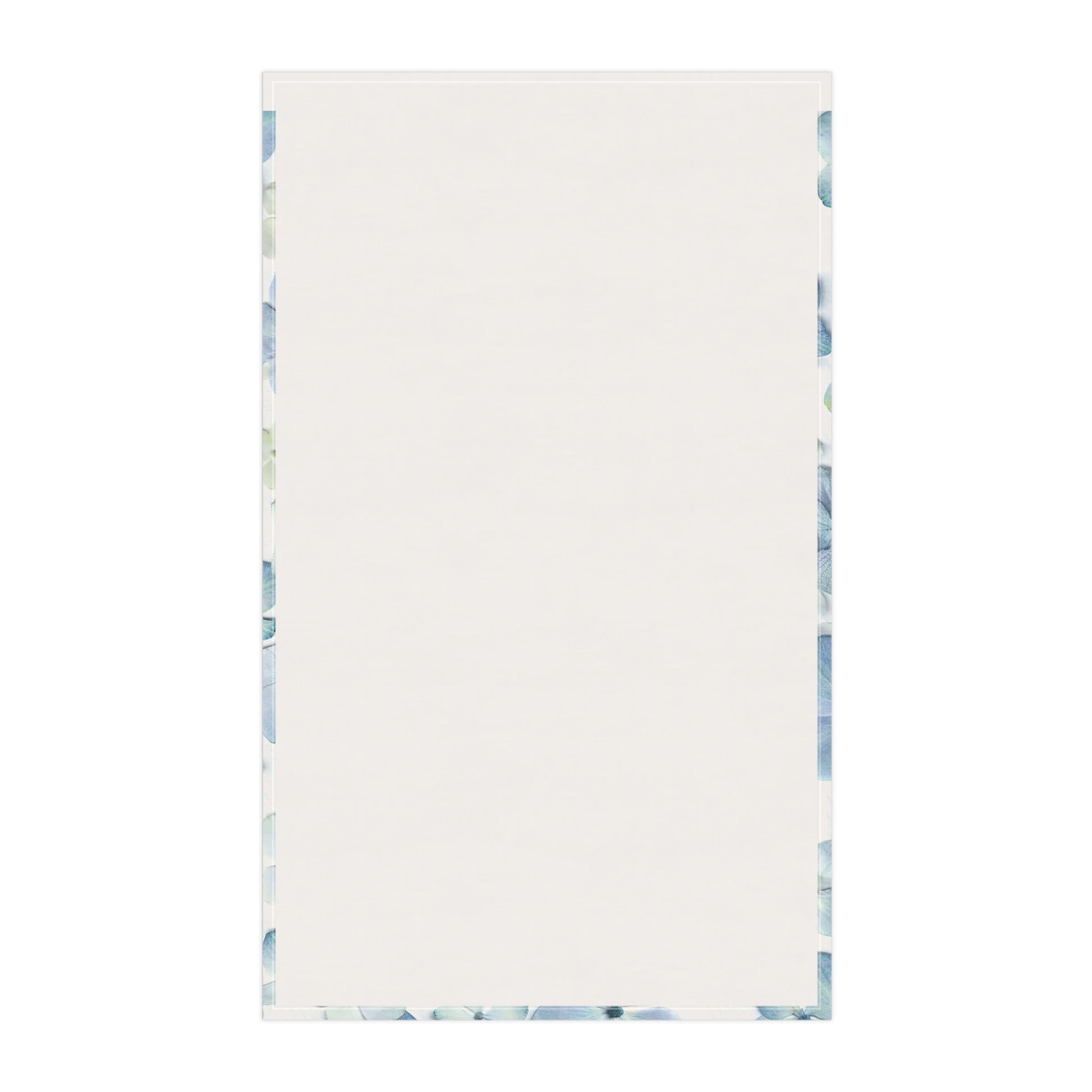 Soft, painterly hydrangea blooms drift across a clean canvas in soothing blues and seafoam greens. This lightweight tea towel brings a quiet, botanical calm to morning routines — blotting up coffee spills, cradling fresh bread, or adding a gentle floral layer to open shelving. The airy, hand-painted look feels like sunlight through a kitchen window and pairs beautifully with farmhouse, coastal, and cottage-style homes. Choose absorbent cotton for everyday utility or polyester for vivid color and long-lasting stretch; either way the hemmed edges keep it looking tidy through many washes.